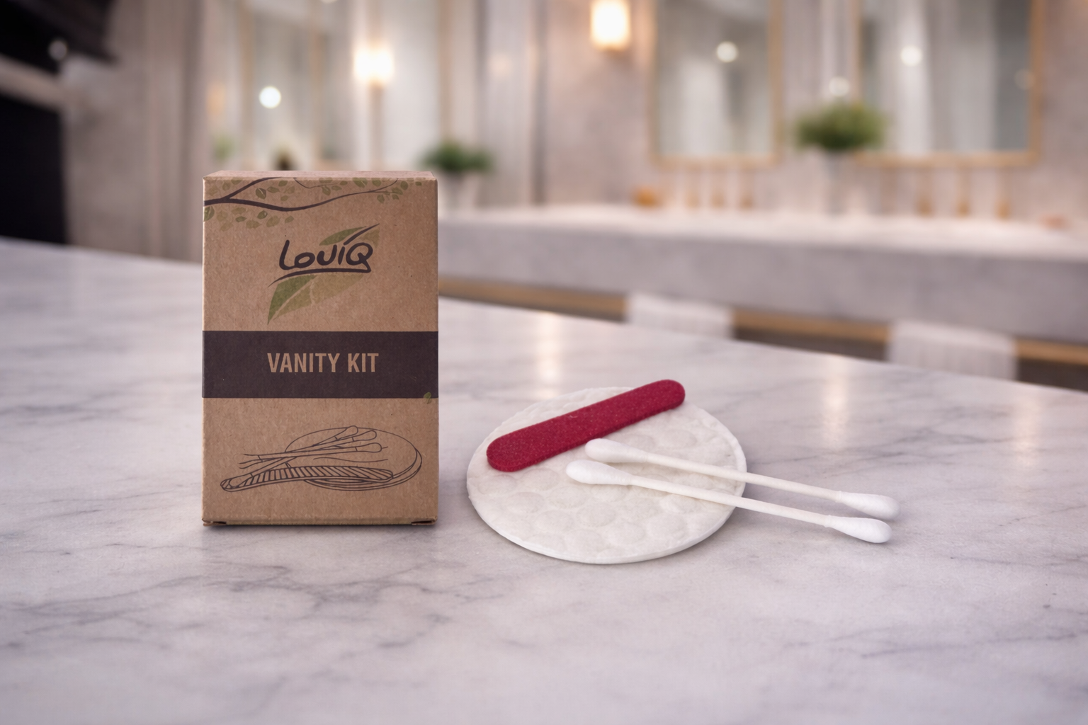 A compact vanity kit made from recycled materials. Includes cotton buds, cotton pads, and a nail file for convenient everyday personal care.